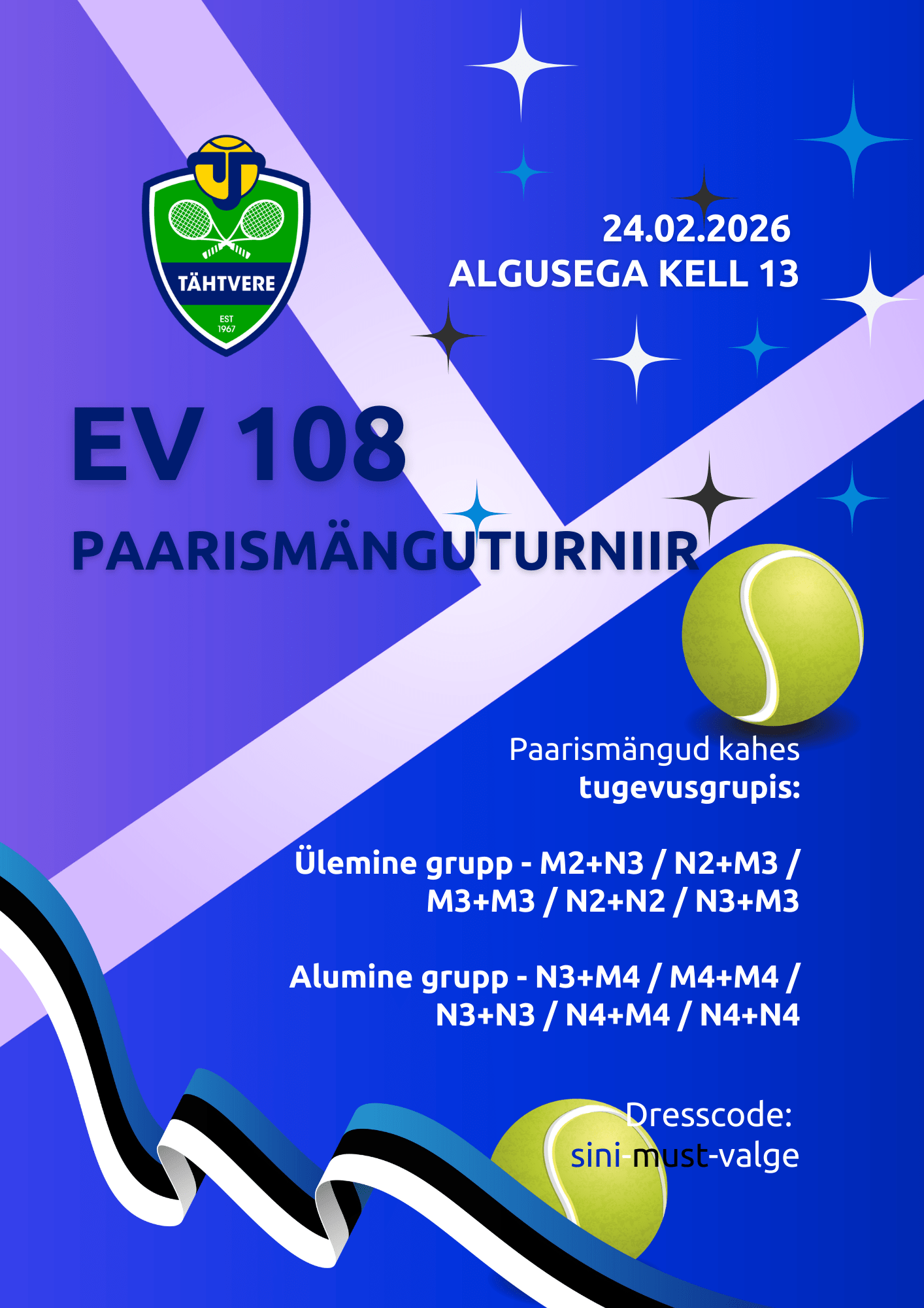 Tule tähista Eesti Vabariigi 108. sünnipäeva tenniseturniiril 24.02. algusega kell 13.00!