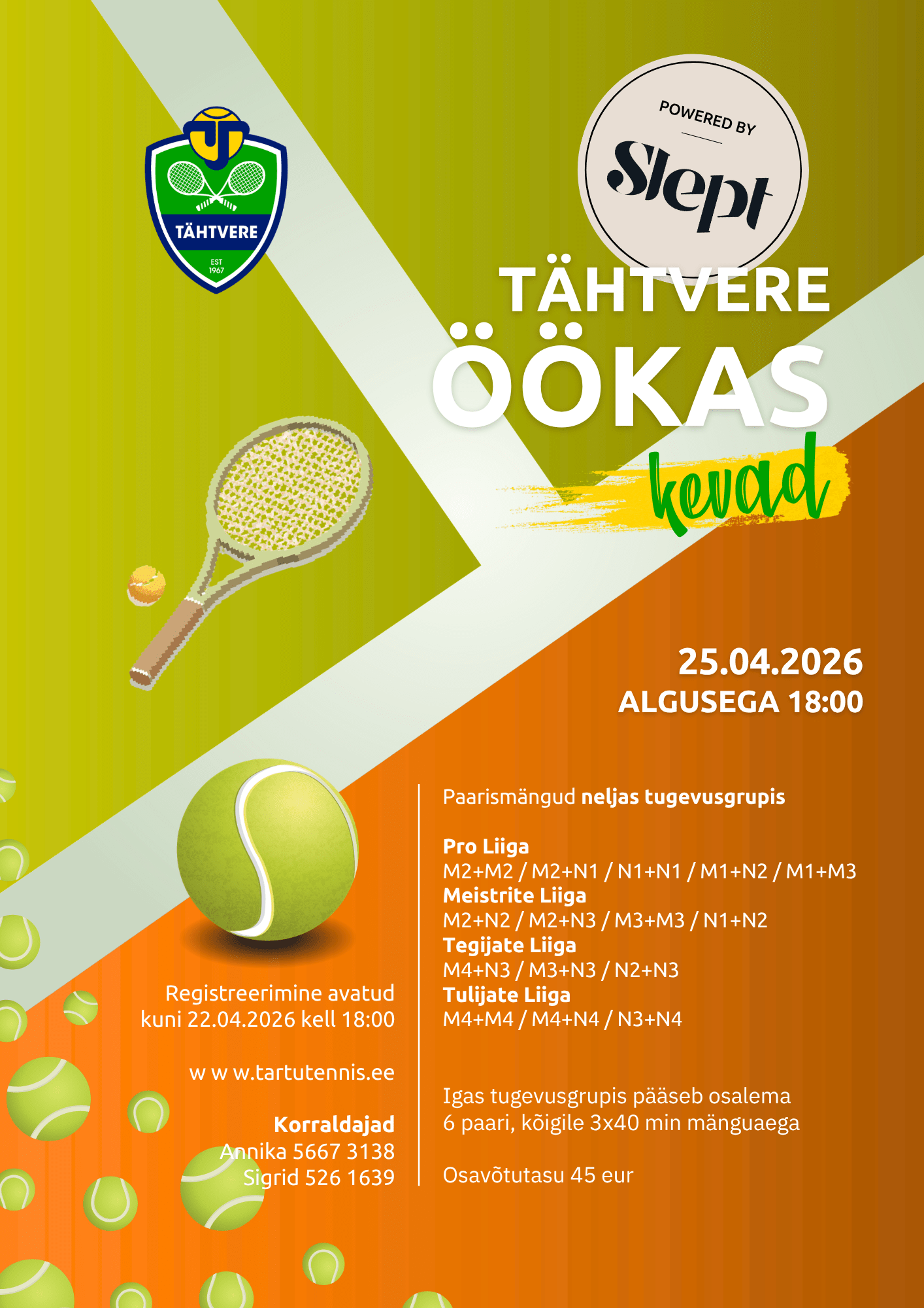 Tähtvere ÖÖKAS powered by Slept on Tartu kõige särtsakam ja meeleolukam paarismänguturniir, mis toob mängurõõmu neljal korral aastas! Turniiril ei loe klubiline kuuluvus ega mängutase – kõik saavad osa, sest igaühele leidub sobiv tugevusgrupp.