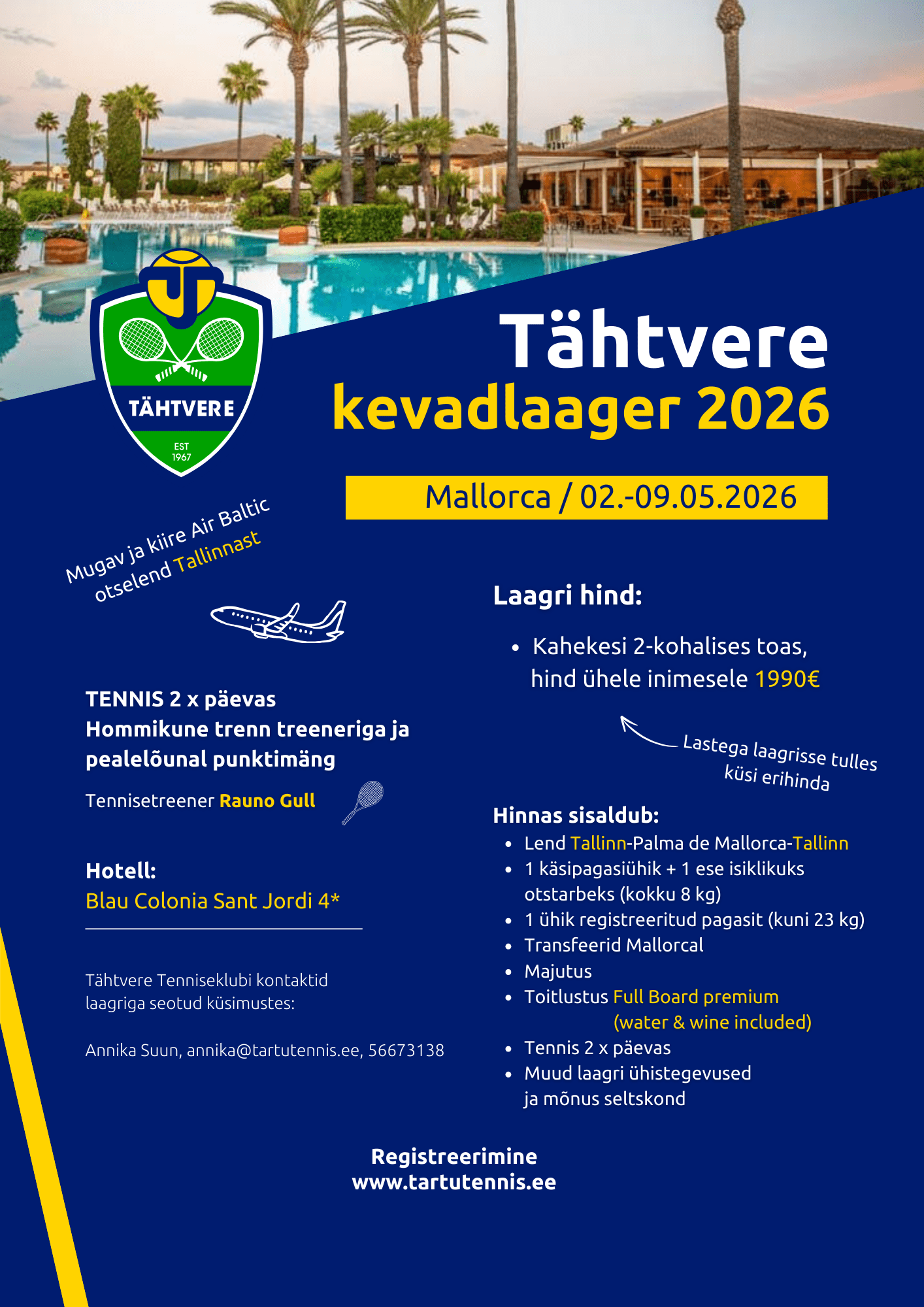 Mallorca ja treener Rauno Gull ootavad meid ka sel kevadel! Liitu meiega 02.-09. mail 2026. aastal, et nautida põnevat nädalat, mis on täis meeleolukat tennist, pingutust nõudvaid treeninguid ja unustamatut lõbu.